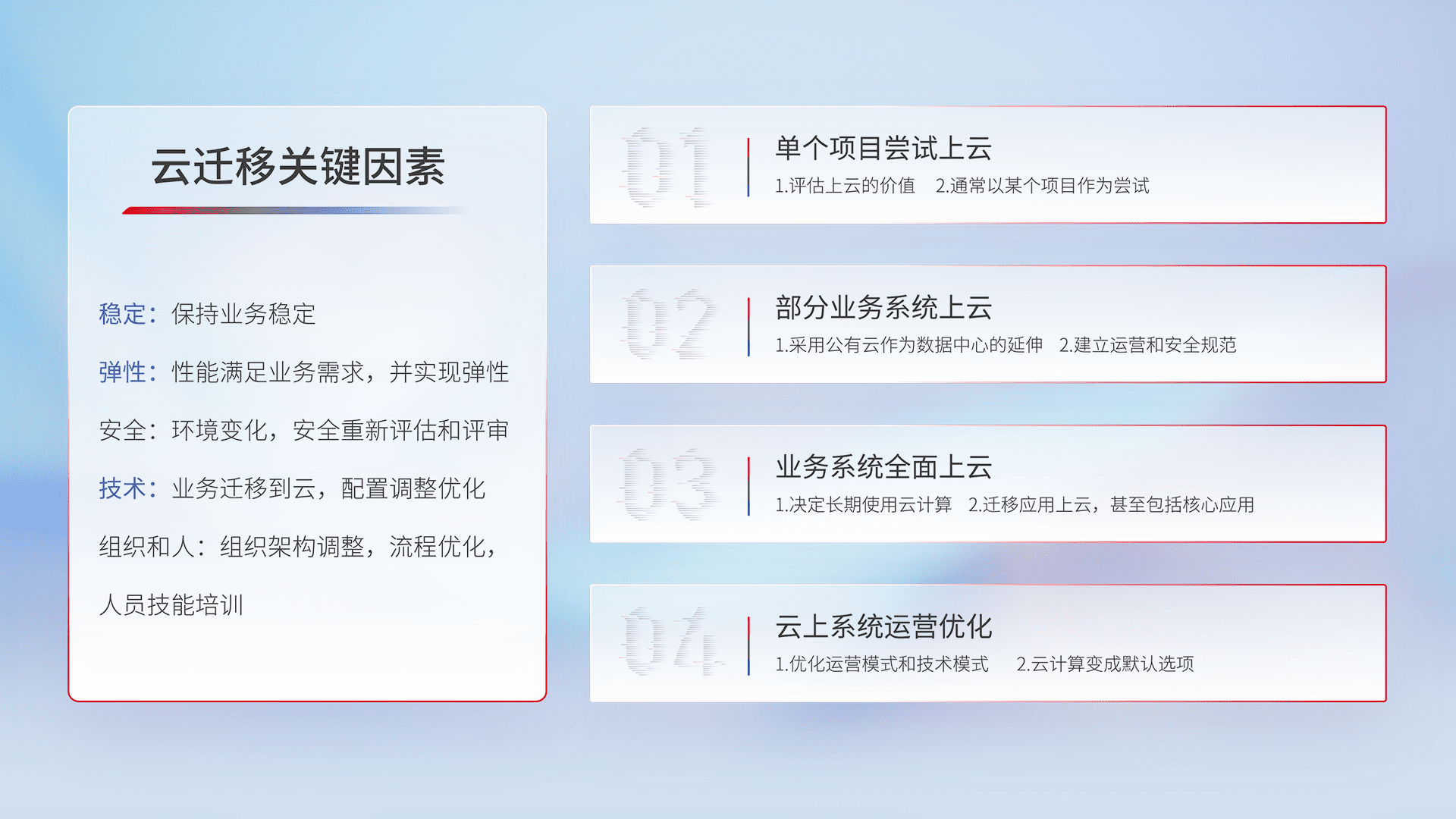 结合实际业务,,从规划设计、、、云平台选型、、、云原生改造、、、数据迁移、、、、集成交付,,迁移全过程为客户识别最佳上云路径,,,,做好风险识别管理,,,设计网络架构、、身份权限、、安全审计合规、、、、操作审计、、日志审计、、监控告警策略、、、多站点容灾设计等,,对云上基础设施进行整体规划,,,提升IT治理水平,,以满足弹性、、、高可用、、、高性能的需求。。
