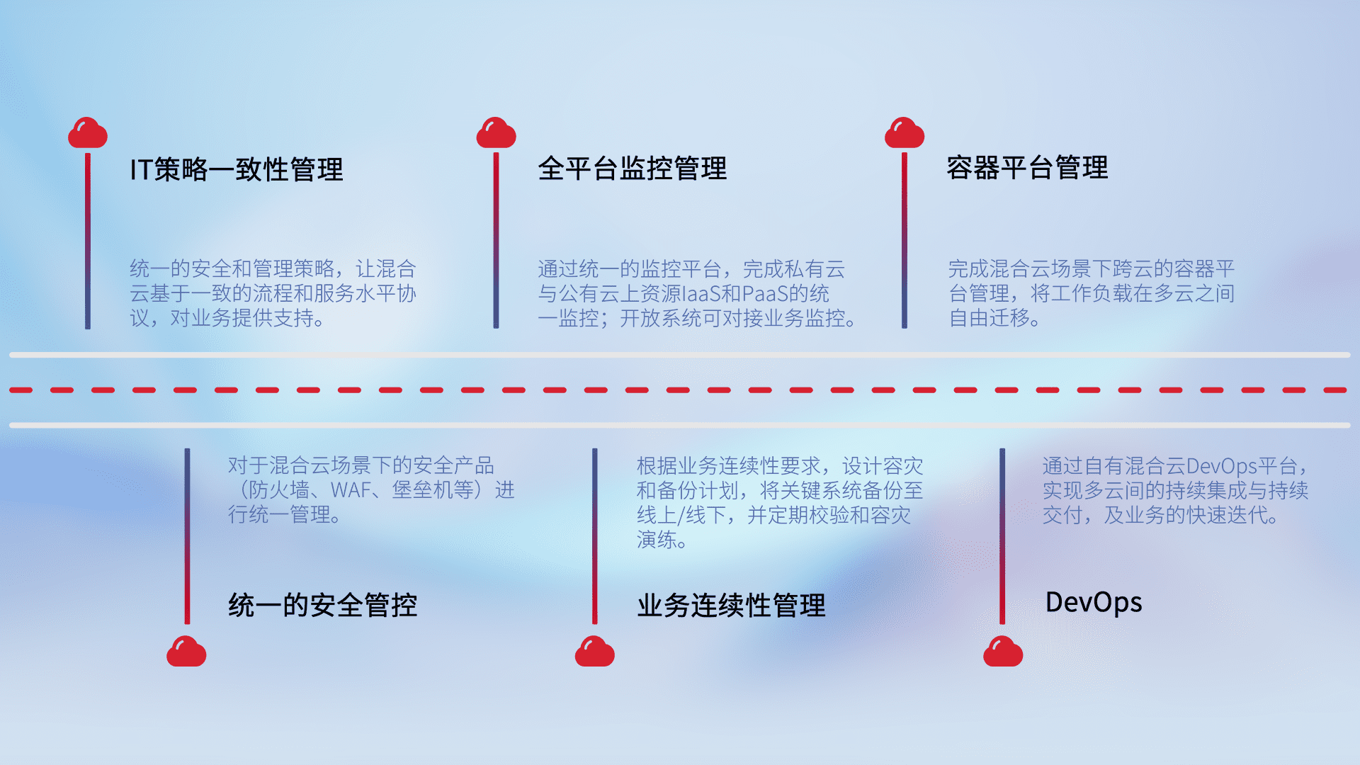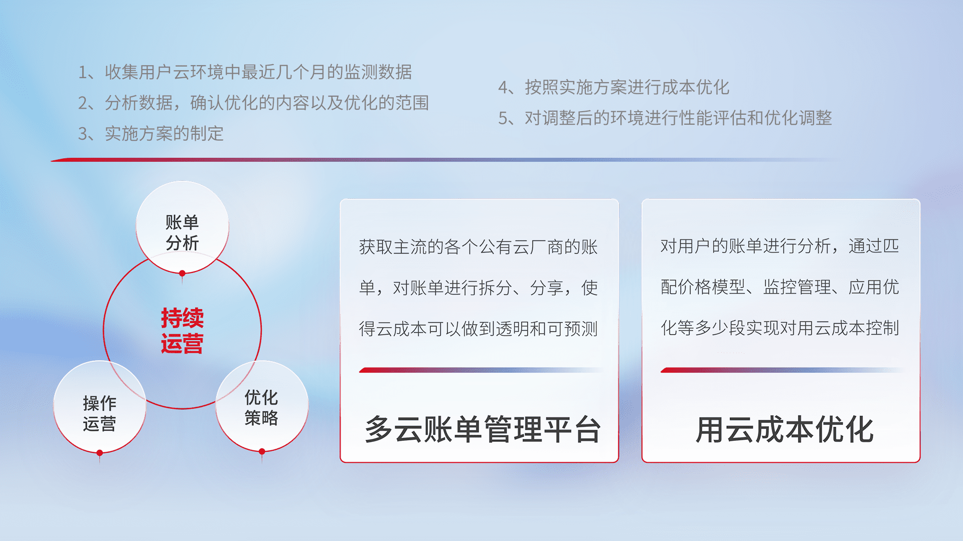通过多云纳管,,以统一的资源数据模型把客户的云资源进行抽象和封装,,进而实现对多云资源的统一操作,,,保障云资源管理的可靠性、、、、稳定性与可用性。。。。量身定制化运维内容,,,,配置、、、开发运维、、、补丁管理、、备份、、监控、、认证和访问管理、、、、审计和日常巡检等,,保障在用云过程中的可靠度,,,稳定度以及高可用率。。。
