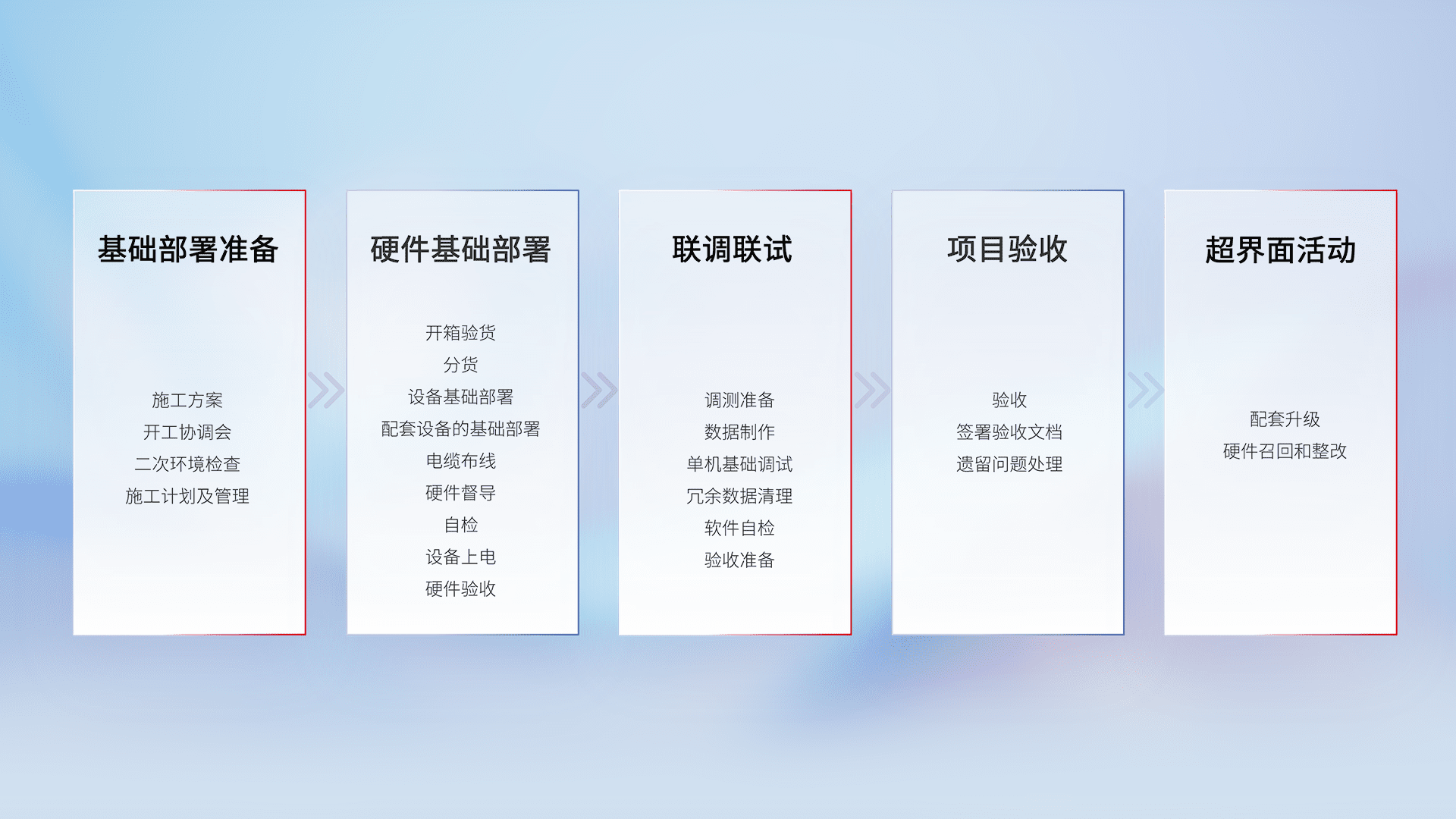 从基础部署准备、、、、硬件基础部署、、、联调联试、、项目验收、、、、越界面活动的全过程可追溯,,,保证施工质量和进度。。